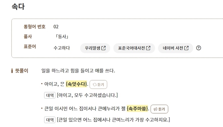 드라마 '폭싹 속았수다'로 잘 알려진 제주어인 '속다'를 제주어 웹사전에서 검색한 화면. 현재 '듣기' 서비스가 중단된 상태다.