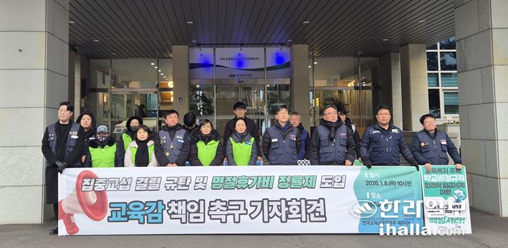 민주노총 공공운수노조 전국교육공무직본부 제주지부(이하 노조)는 8일 오전 제주특별자치도교육청 앞에서 기자회견을 열고 "지난해 12월 집중교섭 결렬의 책임은 명절휴가비 정률제를 거부한 교육부와 시·도교육청에 있다"며 "설 명절 전까지 정률제 도입을 포함한 교섭 타결이 이뤄지지 않을 경우 신학기 총파업을 포함한 전면 투쟁에 나서겠다"고 밝혔다.