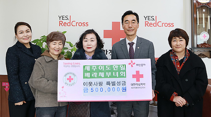 이도한일베라체부녀회(회장 육성순)는 최근 대한적십자사 제주특별자치도지사(회장 정태근)를 방문해 이웃사랑 특별성금 50만원을 기탁했다. 육성순 회장은 "작은 정성이지만 도움이 필요한 분들에게 희망이 되기를 바라는 마음으로 준비했다"고 전했다.