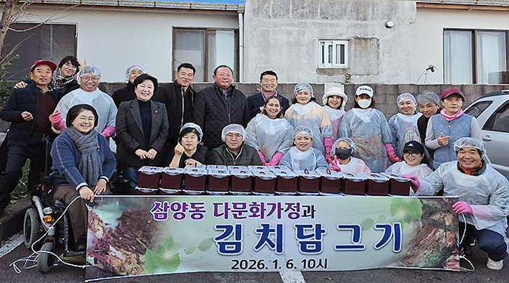 제주시 삼양동주민자치위원회(위원장 송신용)는 지난 6일 삼양동주민센터 주차장에서 다문화가정과 함께하는 김치 담그기 행사를 진행했다.