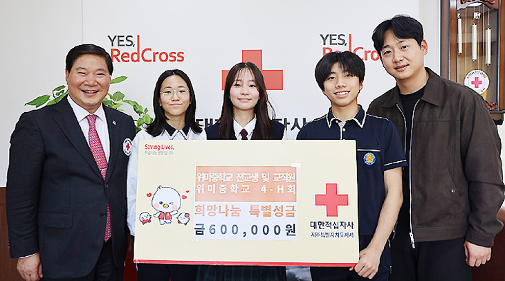 위미중학교(교장 류상언)는 지난 6일 학생과 교직원이 함께 모은 성금 60만원을 대한적십자사 제주특별자치도지사(회장 정태근)에 기부했다.