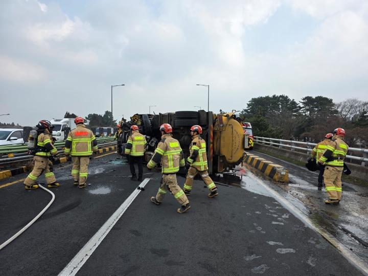 10일 오전 서귀포시에서 제주시로 향하는 평화로에서 음식물쓰레기차량이 중앙분리대를 들이받고 전복되는 사고가 발생했다. 제주소방안전본부 제공