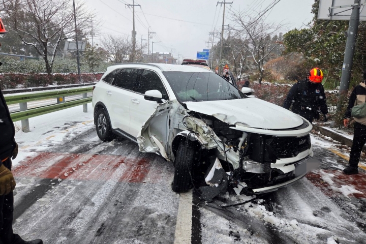 11일 오후 1시 13분쯤 서귀포시 안덕면에서는 폭설로 도로가 얼어 차량 4대가 부딪히는 사고가 발생했다. 제주소방안전본부 제공
