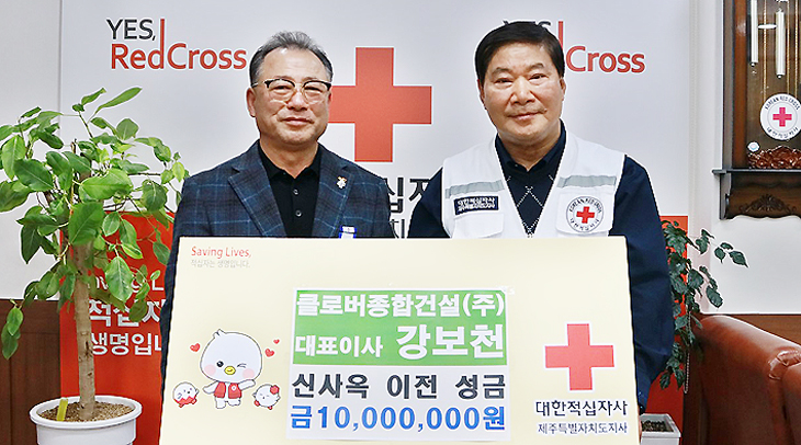강보천 클로버종합건설(주) 대표는 대한적십자사 제주특별자치도지사(회장 정태근)에 1000만원의 신사옥 이전 성금을 기탁했다.