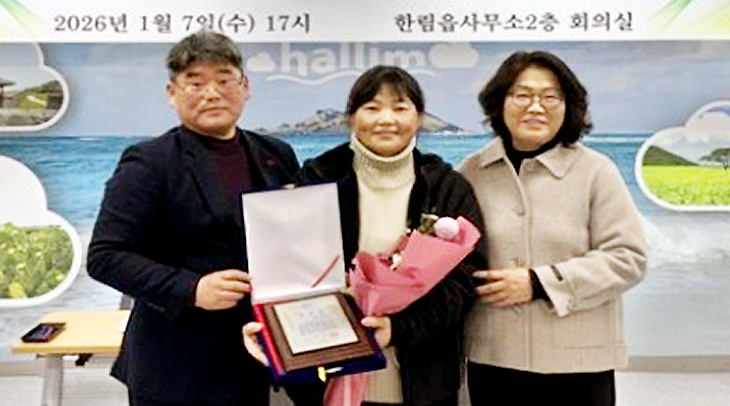 제주시 한림읍새마을부녀회(회장 양정심)는 지난 7일 한림읍사무소 대회의실에서 2026년도 정기총회를 개최해 새해 운영 계획을 논의하고, 퇴임 부녀회장에 대한 공로패 수여식을 진행했다.
