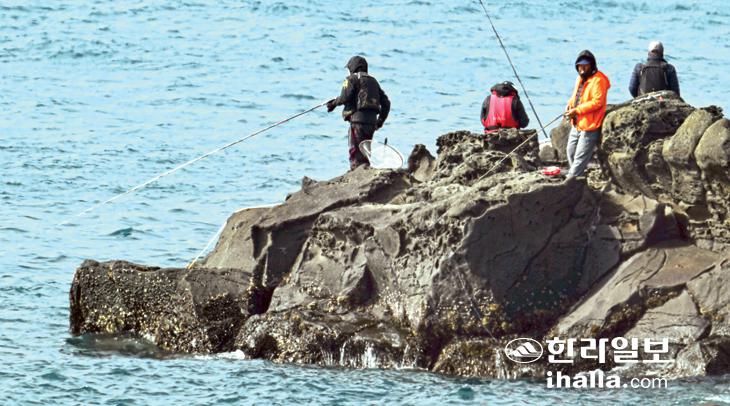 [한라일보]  10일 서귀포시 대정읍 해안에서 낚시꾼들이 강한 바람속에 대물을 기대하며 낚시를 즐기고 있다. 강희만기자