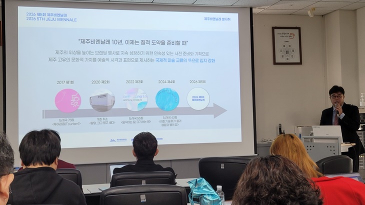 이종후 제주도립미술관장은 12일 오전 도립미술관 회의실에서 열린 '2026 제5회 제주비엔날레'의 운영방향과 전시 주제를 공개하는 기자간담회에서 이같이 밝히며 "제주 원도심 전체를 하나의 거대한 전시장으로 확장하는 것은 '일상에서 함께하는 비엔날레'라는 의미가 담겼다"며 "전시를 보러 '가는 것'이 아닌 도시를 걷다 '만나는' 구조"라고 전했다.