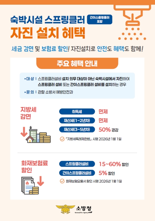 [한라일보] 제주특별자치도소방안전본부(본부장 박진수)는 숙박시설이 스프링클러 설비 또는 간이스프링클러설비를 자진 설치할 경우 세금 감면과 화재보험료 할인 혜택을 받을 수 있다고 13일 밝혔다.