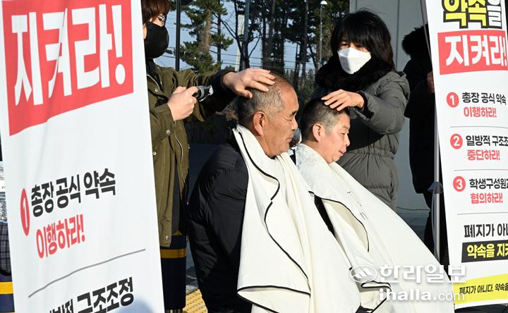 13일 오전 제주대 미래융합대학 실버케어복지학과 김상돈 동문회장과 재학생 유수경 씨가 대학 측의 학습권 침해에 대한 즉각적인 시정을 요구하며 제주대학교 산학협력관 앞에서 삭발식을 진행하고 있다. 강희만기자