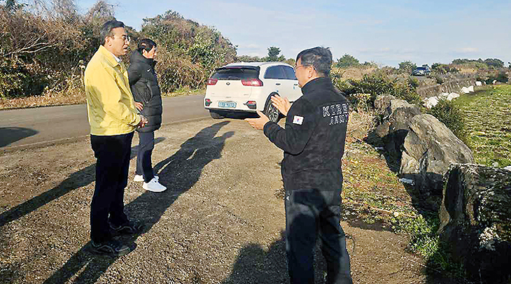 <오순문 서귀포시장은 지난 12일 월동무 재배지를 방문하여 생육상황을 확인하고 주말 대설에 따른 한파 피해상황을 점검했다.