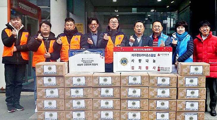 제주정도라이온스클럽(회장 전홍석)은 지난 12일 사랑의 김치 40상자를 제주시 아라동주민센터(동장 현치하)에 기탁했다.