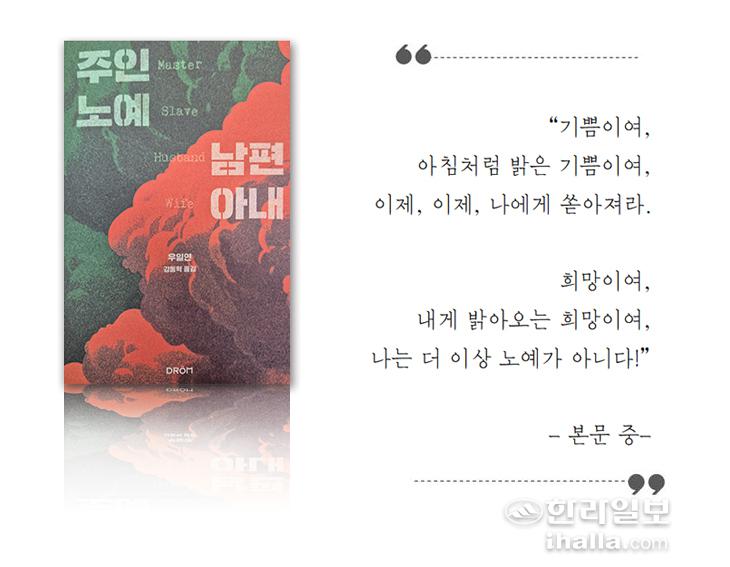 [한라일보] 1848년 12월, 미국 조지아주 메이컨에서 그 누구도 상상하지 못한 대담한 탈출극이 시작됐다. 흑인 노예 신분이었던 엘런과 윌리엄 크래프트 부부가 자유를 찾아 북부 필라델피아로 향하는 목숨을 건 여정에 오른 것이다. 한국계 미국인 작가 우일연(Yiyun Li)이 펴낸 두 번째 책 '주인 노예 남편 아내(Master Slave Husband Wife)'는 이 믿기 힘든 실화를 바탕으로 억압에 맞서 자유를 선택한 인간의 보편적 투쟁과 사랑의 기록을 생생하게 전한다.