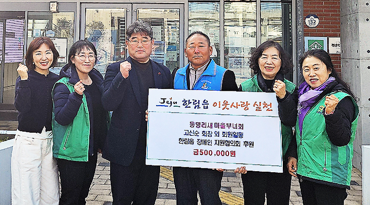 제주시 동명리부녀회(회장 고신순)는 지난 14일 한림읍장애인지원협의회에 50만원을 후원했다. 이날 동명리부녀회는 지역복지 후원금으로 한림읍지역사회보장협의체(공동위원장 고석건·함동윤)에도 50만원을 기탁했다.