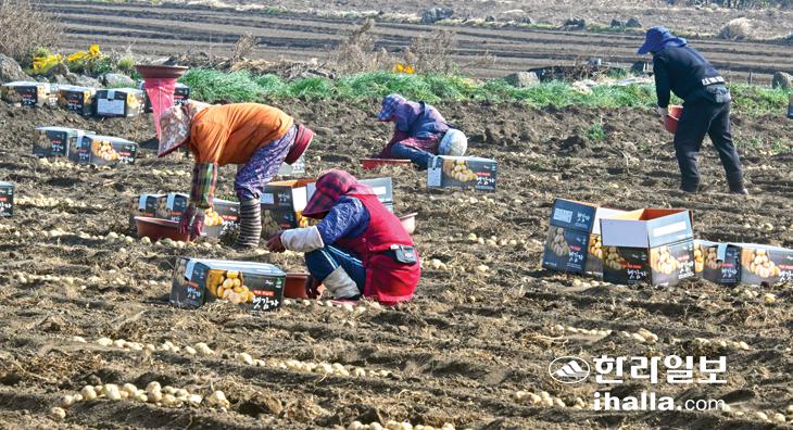 [한라일보] 18일 서귀포시 대정읍 하모리 한 농경지에서 농민들이 겨울감자를 수확하고 있다. 강희만기자