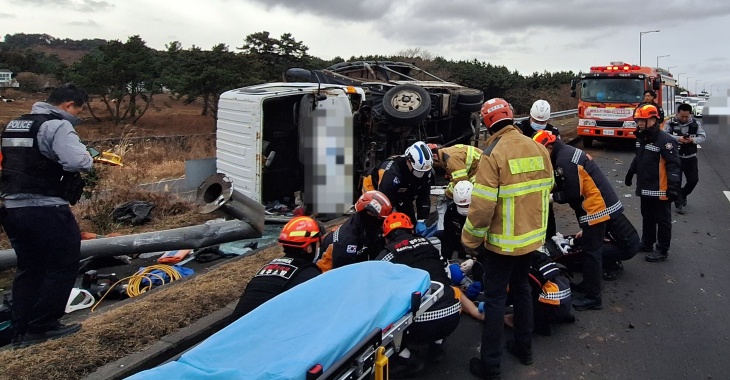 제주 평화로서 화물차 전도… 운전자 심정지 등 …