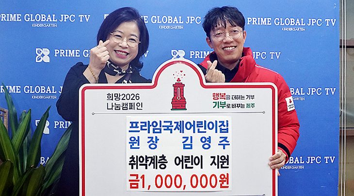김영주 프라임국제어린이집 원장은 최근 어린이집에서 이웃사랑 성금 100만원을 제주사회복지공동모금회(회장 강지언)에 기탁했다.