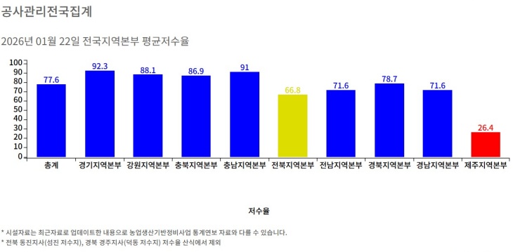 공사가 관리하는 전국의 저수지 1868곳의 평균 저수율이 78.2%로 평년 73.4%를 웃돌고 있는 것과는 매우 대조적이다. 지역별 저수지 저수율은 경기(97곳) 92.3%, 강원(76곳) 88.0%, 충북(138곳) 85.7%, 충남(189곳) 91.2%, 전북(203곳) 66.3%, 전남(505곳) 72.3%, 경북(333곳) 79.0%, 경남(317곳) 71.8% 등이다.