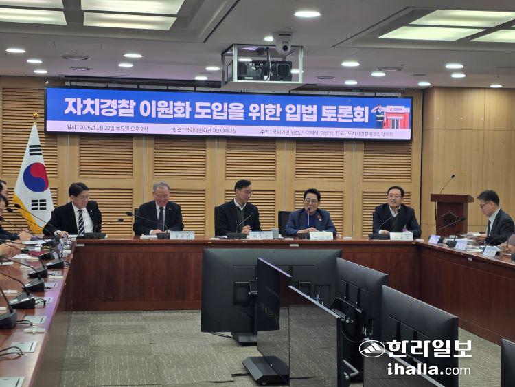 22일 국회에서는 국회 행정안전위원회 위성곤 국회의원(더불어민주당·서귀포시)을 비롯해 이해식·이상식 민주당 국회의원, 전국시도자치경찰위원장협의회가 공동으로 마련한 '자치경찰 이원화 도입을 위한 입법 토론회'가 열렸다.