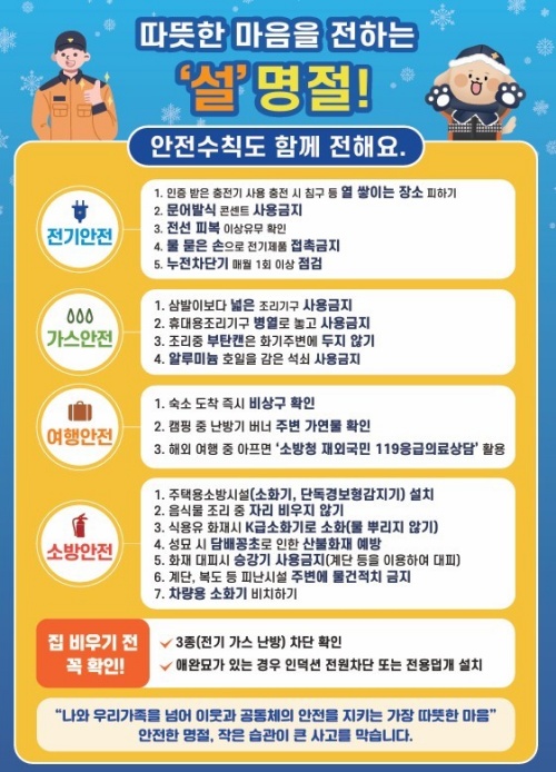 도소방안전본부에 따르면 최근 5년간(2021~25년) 설연휴에 도내에서 발생한 화재는 40건이다. 이로 인해 2명이 다치고 재산피해는 약 2억9600만원이다.