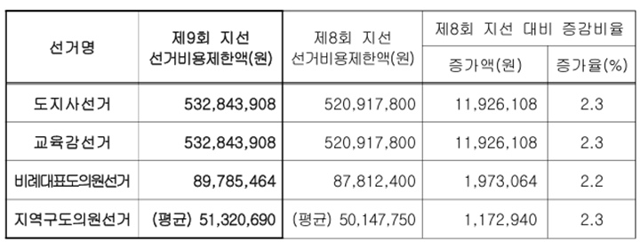 선거비용 제한액은 인구수와 읍·면·동수에 전국소비자물가변동률을 반영한 '제한액 산정 비율'(8.3%)을 적용하며, 선거사무관계자의 수당 인상액과 산재보험료 등을 더해 최종 산정된다.
