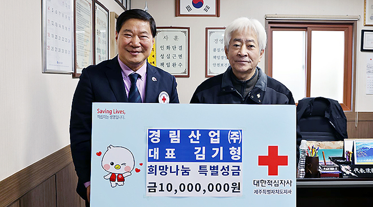 [한라일보] 경림산업(대표 김기형)은 최근 대한적십자사 제주특별자치도지사(회장 정태근)에 제주 지역 내 취약계층 지원을 위한 희망나눔 특별성금 1000만원을 기탁했다.