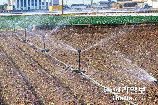 [한라일보] 단비 같은 스프링클러25일 제주시 한경면 고산리 한 농경지에서 스프링클러를 이용해 땅에 물을 주고 있다. 강희만기자