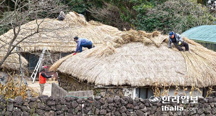 [한라일보] 26일 서귀포시 표선면 성읍민속마을에서 주민들이 새해를 맞아 제주 전통 초가 지붕을 잇는 작업을 하고 있다. 강희만기자