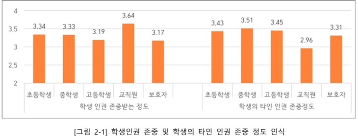 같은 질문에 교직원은 3.64점으로 학교에서 학생인권이 존중받는다고 가장 높게 인식하고 있는 반면, 보호자는 3.17점을 줘 가장 낮게 인식하는 것으로 나타났다.