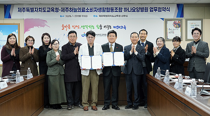 [한라일보] 제주도교육청은 27일 제주하늘의료소비자생활협동조합 하나요양병원(병원장 정용우)과 '장애학생 의료적 지원 제공을 위한 업무협약'을 체결했다.
