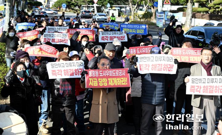동홍동 자생단체는 이날 오전 제주도청 앞에서 집회를 열고 서귀포시 도시우회도로 개설사업의 조속한 추진을 촉구했다. 강희만기자