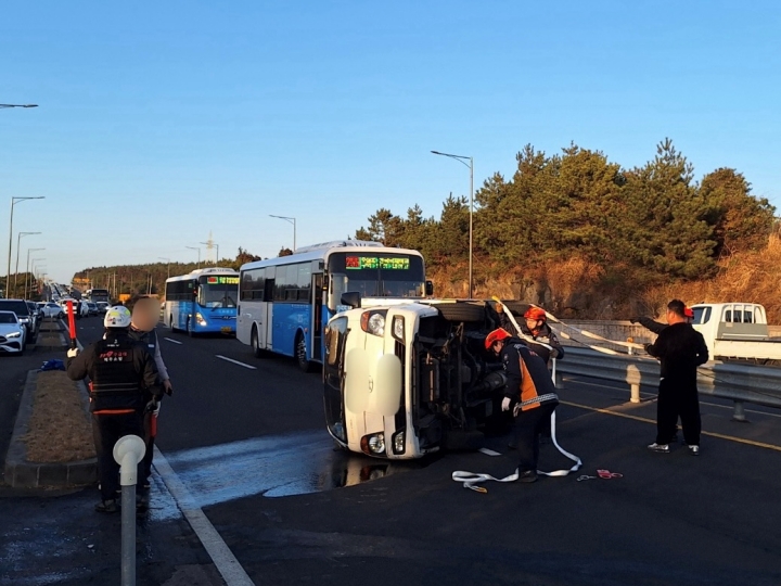 28일 오후 4시 51분쯤 서귀포시 안덕면 광평리 평화로에서 1t 트럭이 전도돼 차량 정체가 빚어졌다. 제주소방안전본부 제공