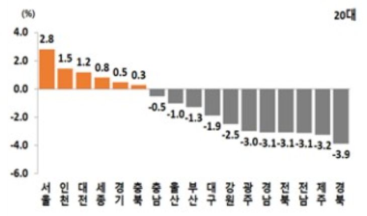 지난해 제주지역 순유출 인구 가운데 20대는 -2198명(20~24세 -1590명, 25~29세 -608명)으로 전체 순유출 인구의 51.4%를 차지해 비중이 가장 컸다. 10대 순유출도 -1067명으로 뒤를 이었다. 20대의 순유출률은 -3.2%로, 전국에서 경북(-3.9%)에 이어 두 번째로 높았고, 10대 순유츌은 -1.5%로, 전국에서 가장 높았다.