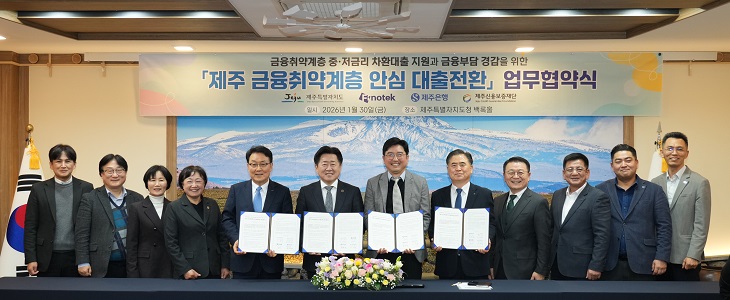 제주도는 30일 백록홀에서 ㈜피노텍, 제주은행, 제주신용보증재단과 함께 이런 내용의 ‘제주 금융취약계층 안심 대출전환’ 업무협약을 체결했다.