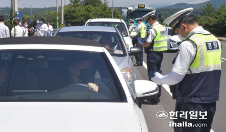 안전띠 미착용 단속을 벌이고 있는 제주경찰. 한라일보DB