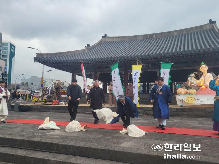 2일 오후 제주시 관덕정 광장에서 열린 '2026 병오년 탐라국 입춘굿'에서 항아리를 깨서 액운을 제주 밖으로 내보내는 의식인 '사리살성'이 진행됐다. 박소정기자