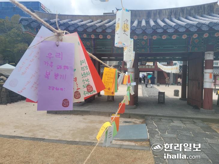 2일 오후 제주시 제주목 관아에 걸린 '2026 병오년 탐라국 입춘굿' 소원지. 박소정기자