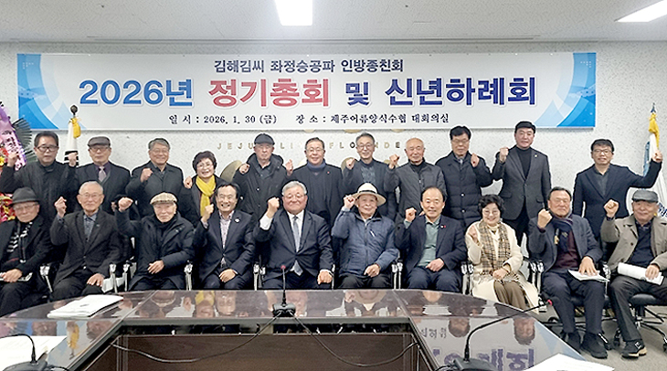 김해김씨 좌정승공파 인방종친회(회장 김수형)는 지난달 30일 제주어류양식수협에서 정기총회 및 신년하례회를 개최했다. 이날 좌정승공파(회장 김남식)를 비롯한 종친들이 참석한 가운데 2025년도 사업 결산과 2026년도 사업 예산안 등을 심의·의결했다.