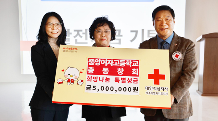 중앙여자고등학교 총동창회(회장 고은실)는 최근 대한적십자사 제주특별자치도지사(회장 정태근)에 희망나눔 특별성금 500만원을 기탁했다.