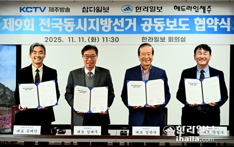 지난해 11월에 열린 한라일보와 삼다일보, KCTV제주방송, 헤드라인제주 등 제주지역 대표 언론 4사 \\\\\\\'제9회 전국동시지방선거 공동보도 협약식\\\\\\\'. 왼쪽부터 공대인 KCTV제주방송 대표, 김대우 삼다일보 대표, 김한욱 한라일보 대표, 윤철수 헤드라인제주 대표. 강희만기자
