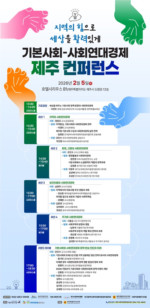 [한라일보] 제주특별자치도는 위성곤·김한규 국회의원, 기본사회연구회 등과 함께 오는 5일 오후 1시 호텔 시리우스에서 '기본사회-사회연대경제 제주 컨퍼런스'를 개최한다.