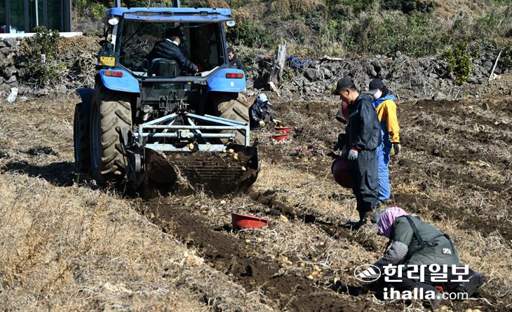 [한라일보] 3일 서귀포시 표선면 한 농경지에서 농민들이 겨울감자 수확 작업을 하고 있다. 강희만기자