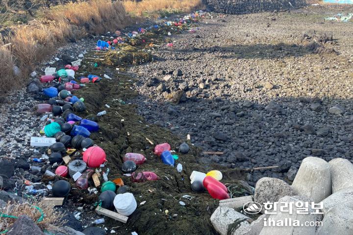 4일 오전 제주시 이호동의 한 해안가 한편에 괭생이모자반과 해양쓰레기가 가득하다. 양유리기자