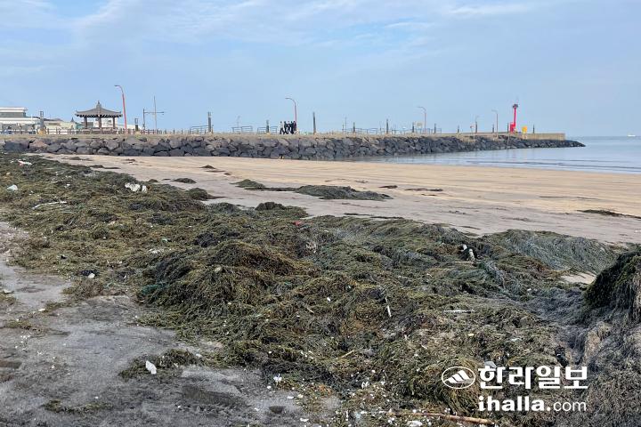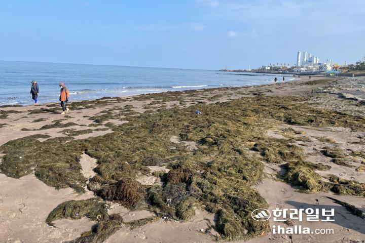 지난달부터 제주지역 해안가로 괭생이모자반이 다량으로 유입되면서 도내 해안가 곳곳이 몸살을 앓고 있다. 특히 모래사장 위 괭생이모자반이 폐어구, 해양쓰레기와 뒤섞이며 도내 주요 관광지인 해수욕장의 미관을 해치고 있다.