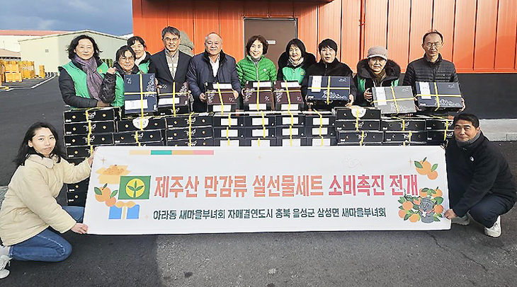 제주시 아라동부녀회(회장 김자선)와 아라동(동장 고창기)은 지난 2일 자매결연 마을인 충북 음성군 삼성면부녀회에 천혜향 110상자를 전달했다.