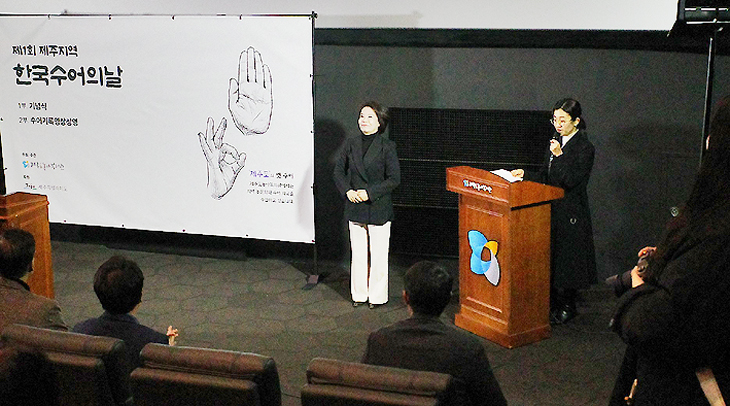 제주도농아복지관(관장 문성은)이 주최한 '제1회 제주지역 한국수어의 날 기념식'이 한국수어의 날(2월 3일)인 지난 3일 메가박스 제주아라점에서 개최됐다.