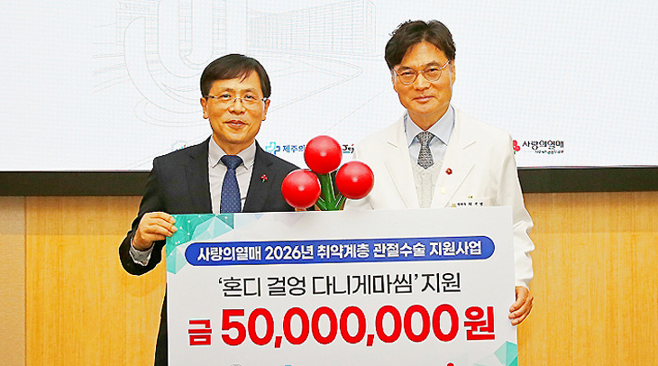 제주사회복지공동모금회(회장 강지언·사랑의열매)는 지난 3일 제주대병원(원장 최국명) 국제회의실에서 취약계층 관절수술 지원사업비 5000만원을 전달했다.