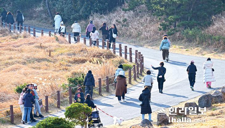 송악산 오르는 탐방객들