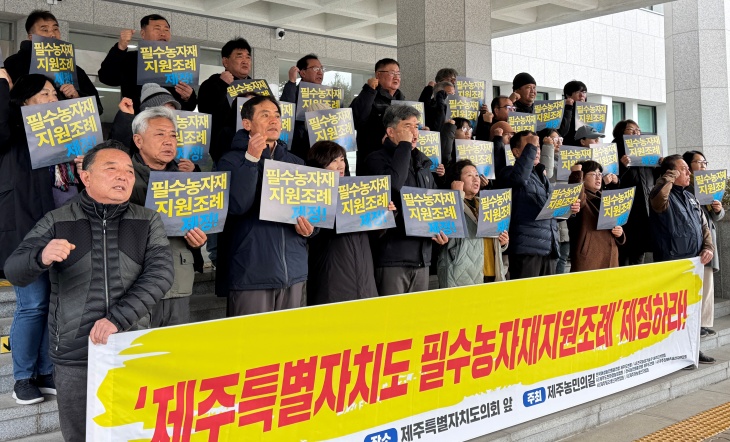 [한라일보] 제주 농민들이 3년째 표류 중인 '제주특별자치도 필수농자재 지원조례'에 대한 조속한 처리를 촉구했다.