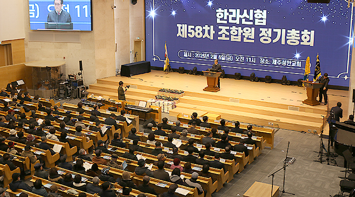한라신용협동조합(이사장 강정신)은 창립기념일인 지난 6일 제주성안교회에서 '제58차 조합원 정기총회'를 개최했다. 이날 강정신 현 이사장이 상임이사장으로 연임되고 이호성 상임이사가 새롭게 선임됐다.