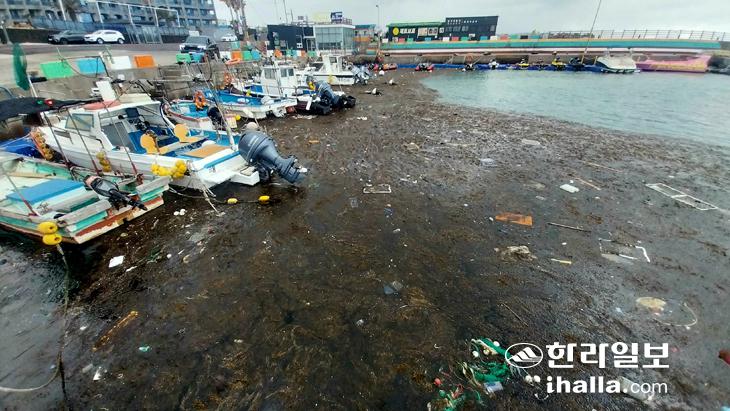 [한라일보] 지난 7일 제주시 애월읍 구엄포구에 제주바다 불청객인 괭생이모자반이 쌓여있다. 강희만기자